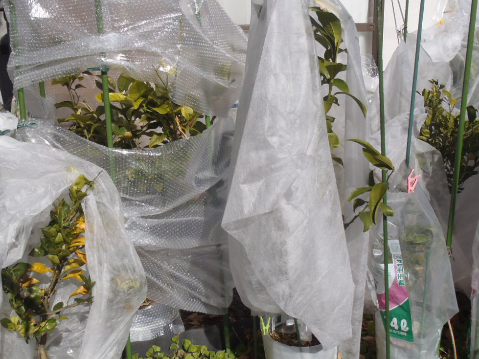休日の晴天時には防寒用の囲いを持ち上げ、日光に当ててます。