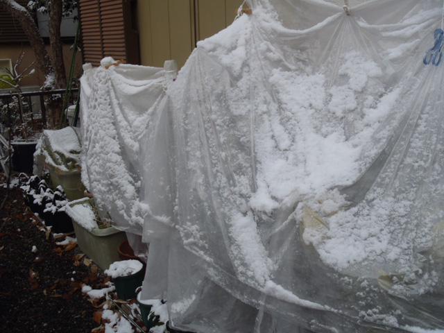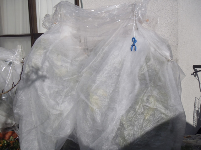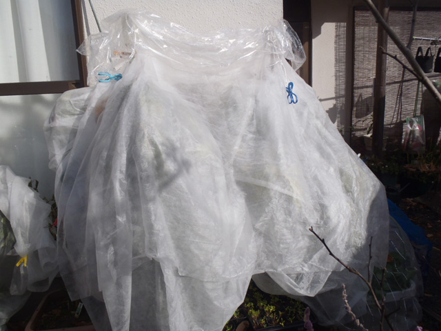 | 寒風除けにビニールを下した状態。天気の良い昼間はこの状態で多少なりとも光合成ができればと。 |