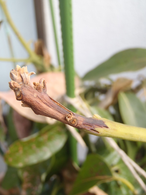 先端は完全に枯れてダメになってますが、下部の方は葉が出てきました。