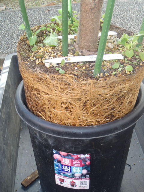 この鉢は「果樹用」のため鉢替前提に作られ、底板が固定されてなく持ち上がる作りになっている。
