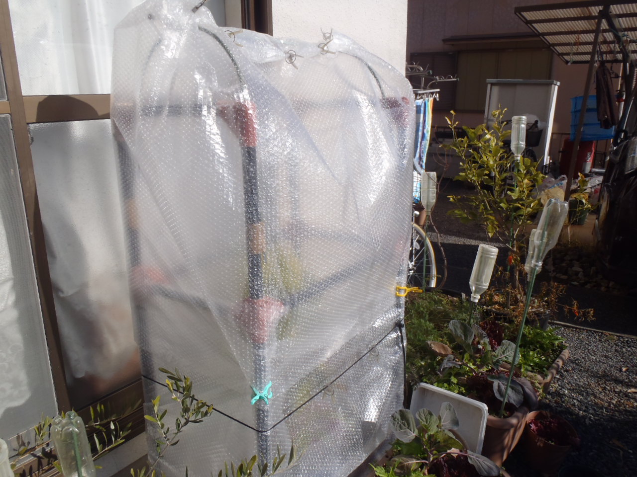 おいらが休みの時には温室の緩衝材を開けて気温の上昇をおさえているけど、平日はできないから。