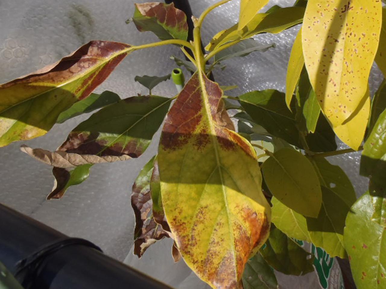 今年は気温が低く、最低気温が0度前後の日が続いているため、アボカドが痛んできました。