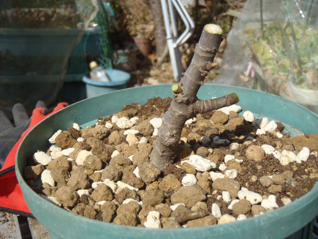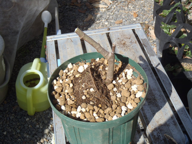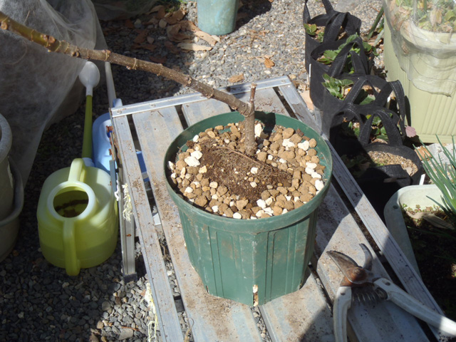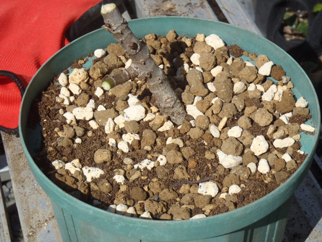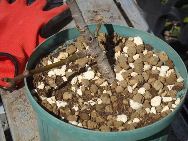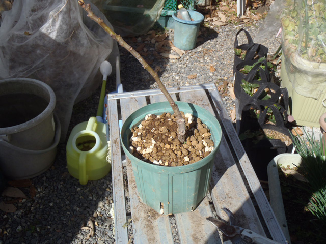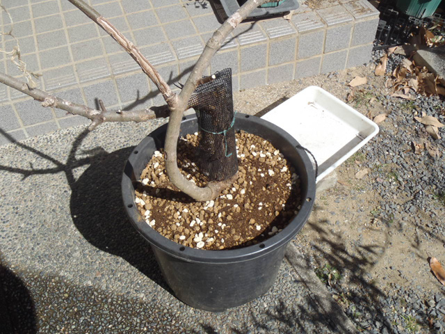 D抜いたイチジクを鉢に戻し、土を入れる。(上面がウオータースペースのギリになるようにする)