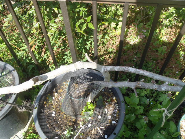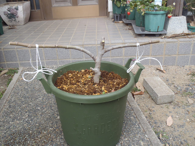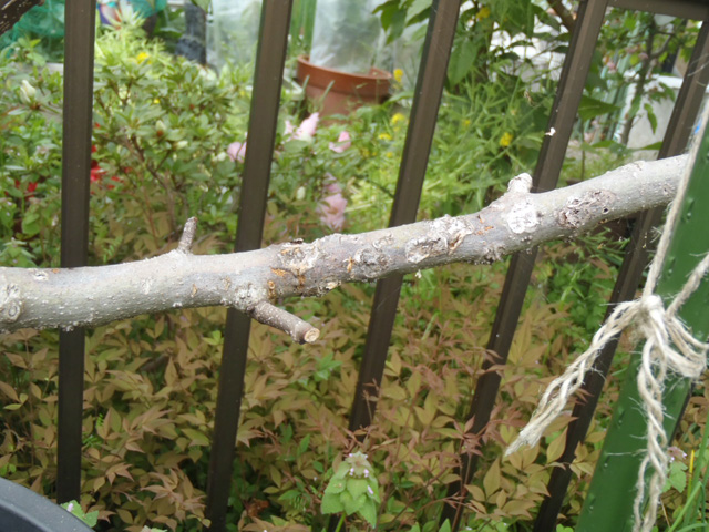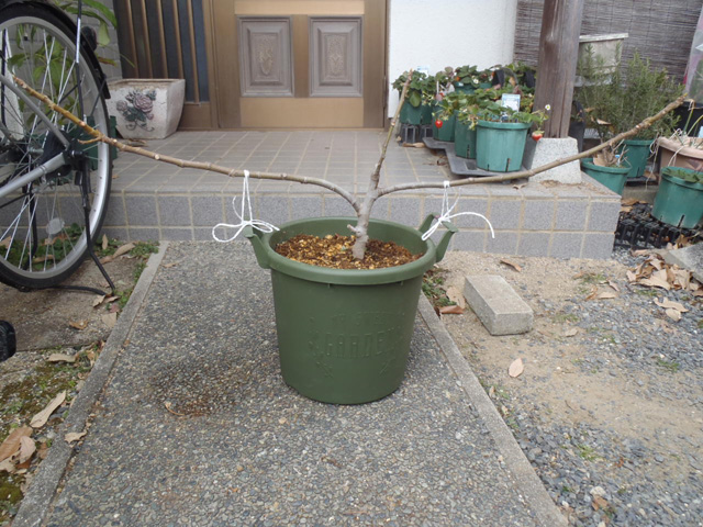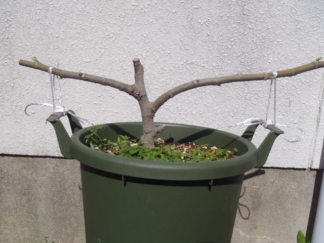 たまたま左右に枝がのびていたので、ひもで枝が地面と平行になるように誘因してみました。