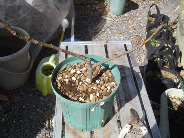 先週、鉢まししたイチジクに肥料をあたえトリミング(剪定)しました。