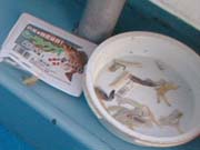 エサは冷凍小ハゼ、冷凍イサザ、魚の切り身などが配られます。