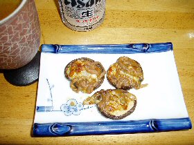塩辛を生椎茸の上に乗せてマヨネーズをかけて焼くだけ。