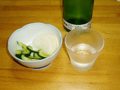 冷酒とお新香(大根とキュウリ)、いいですなぁ〜。