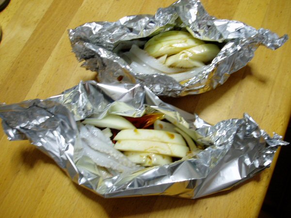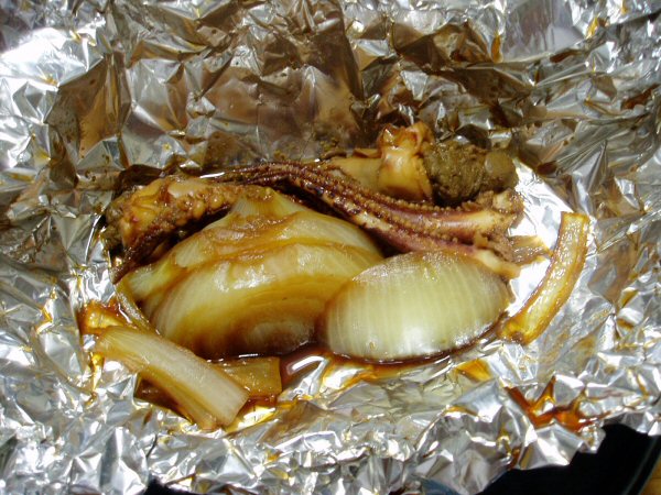 アルミホイルにゲソ、野菜と一緒に入れタレをかけます!!。