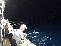 どうやら、帰港する僚船の灯りをもらって釣りをするようだ。 23時ちょっと前に第2ラウンドの開始。海はほぼベタナギ。