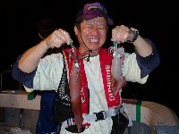 禁断症状が出たか、オイラのスペアのサオを持って舳先で釣りに興じている。