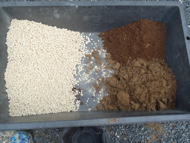 硬質鹿沼、竹パウダー、ピートモスを混ぜて用土を作ります。