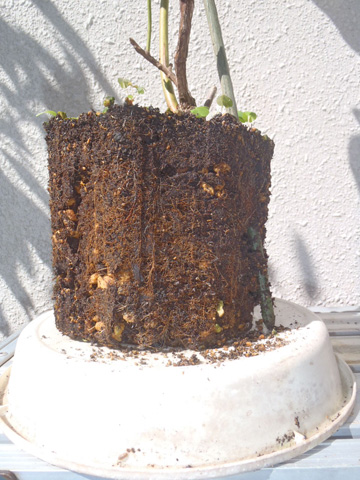 鉢増しをしようと思い、鉢から引っこ抜いたら根鉢が完全でなかったんでヤメにしました。