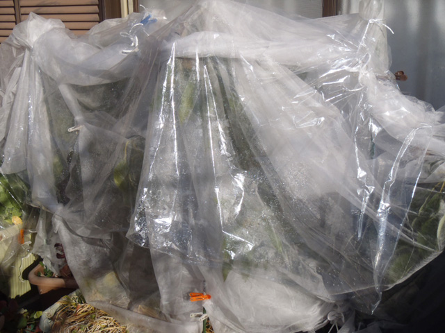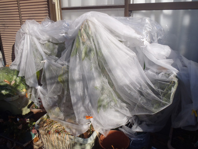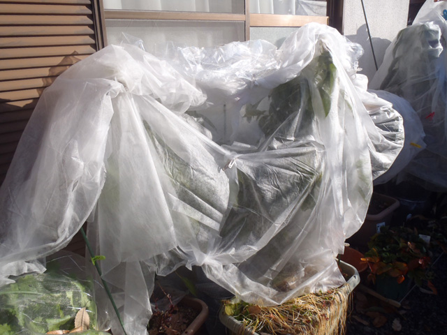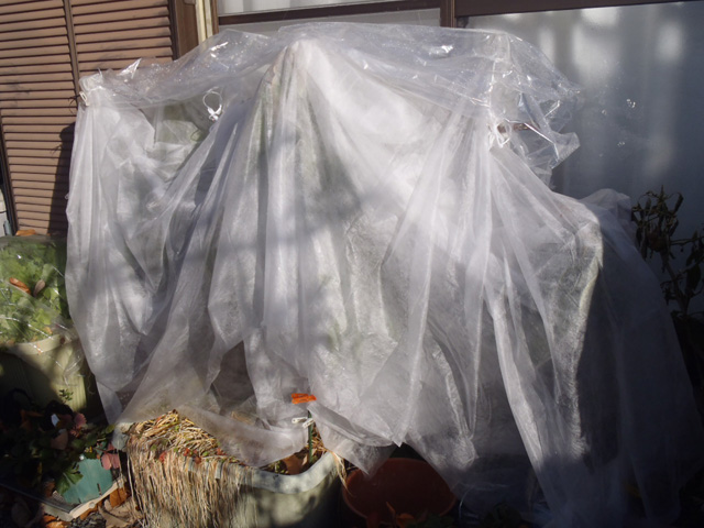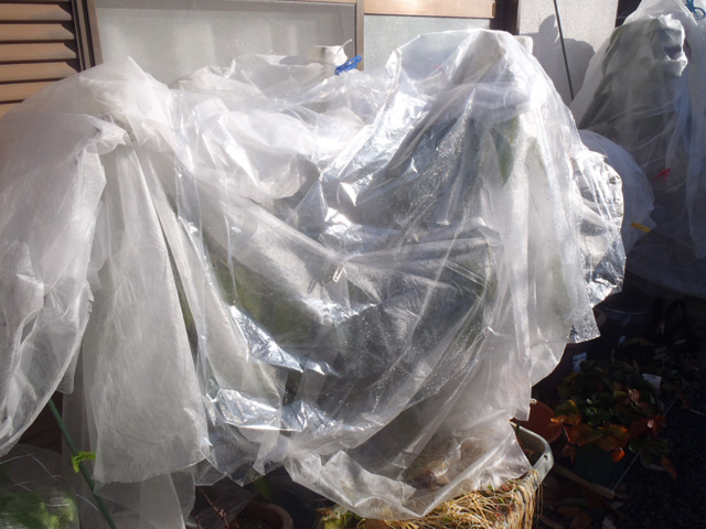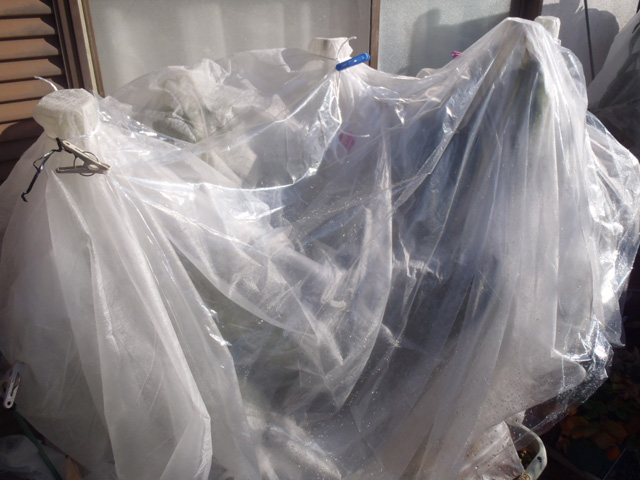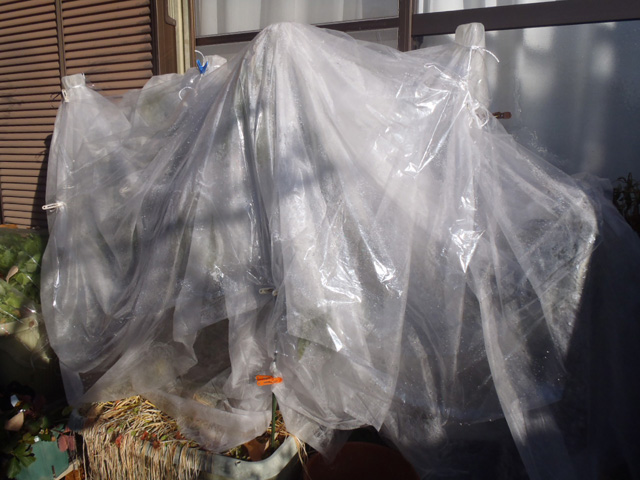 寒風除けにビニールを下した状態。天気の良い昼間はこの状態で多少なりとも光合成ができればと。