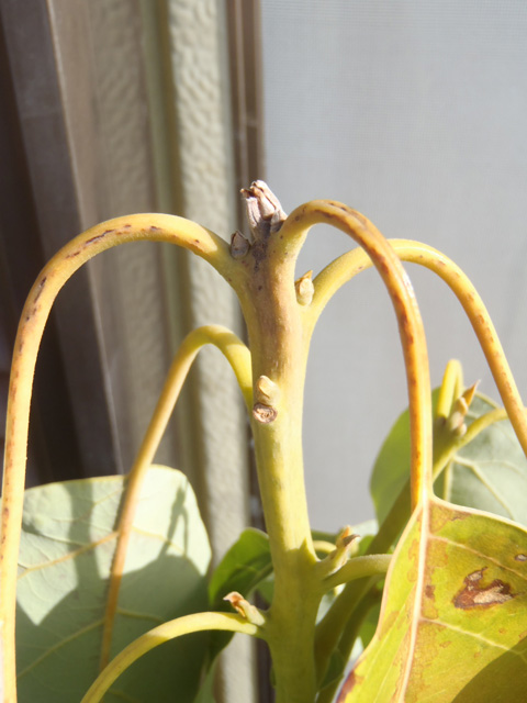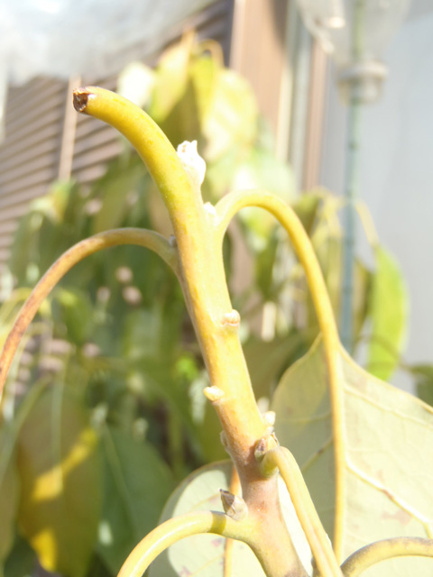 ベーコンと同じで冬場の管理ミスでベーコンの枝の上部の葉っぱが枯れ落ちてます。
